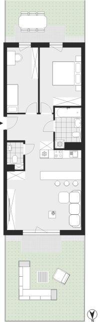 Zapraszamy do zapoznania się z ofertą 2-pokojowego mieszkania, składającego się z pokoju dziennego z aneksem kuchennym, sypialni, łazienki i dwóch ogródków.